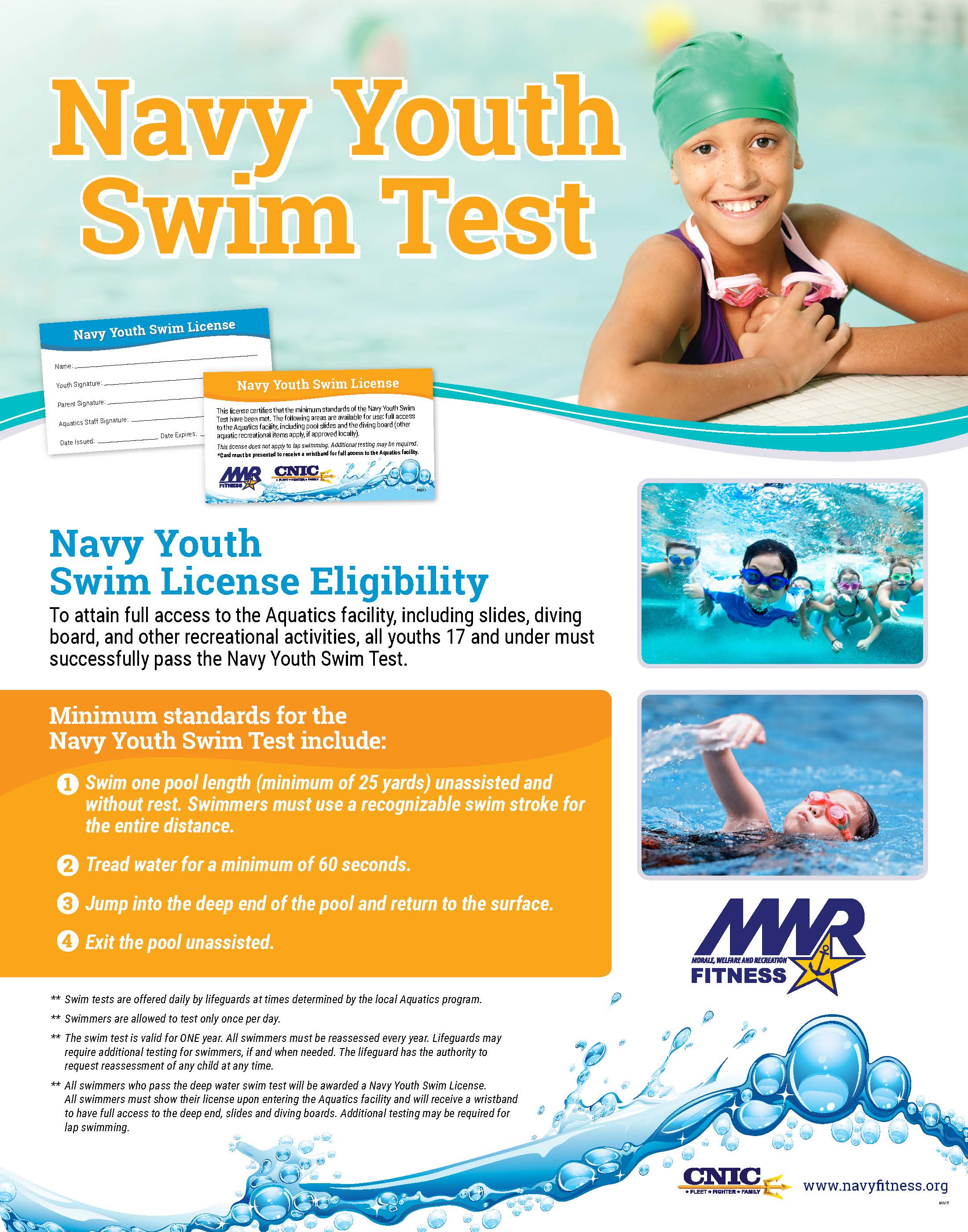 To attain full access to the Aquatics facility, including slides, diving board, and other recreational activities, all youths 17 and under must successfully pass the Navy Youth Swim Test. Contact your local Aquatics program to schedule a swim test.